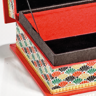 Æsken her har lånt idé til dekorationen fra nogen af de æsker, som Kamma Rahbek lavede for omkring 200 år siden. Dvs. den har hængslet låg med et bånd til at holde låget og guldborter på kanterne. Ofte var der også monteret et spejl i bunden og en glasplade i låget, under hvilken der var monteret en smuk akvarel. Her har jeg dog undladt spejl og glas og sat sort velourpapir på i stedet. Det sorte papir på kanten samt det røde papir er en enkel forsatspapir, mens det mønstrede japanske papir har et smukt viftemønster i gyldent, grønt, sort og guld.