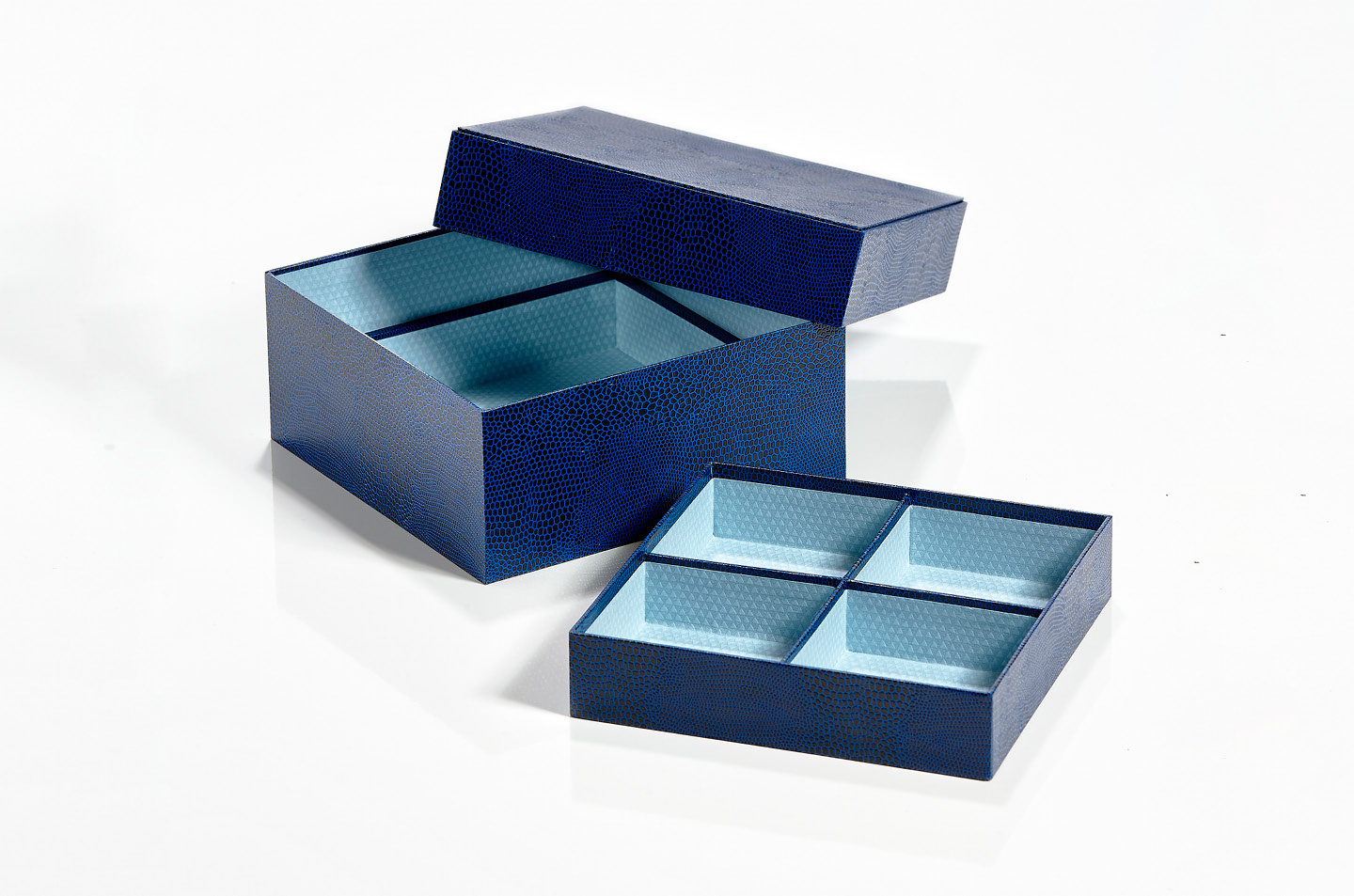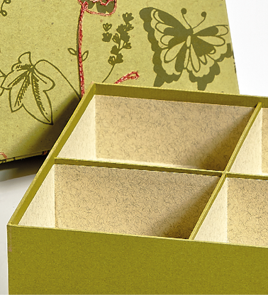 Selve æsken er dekoreret med en olivengrøn forsatspapir og foret med en gråmeleret papir. På modellen her har jeg sænket skillerummene et par mm fra æskens øvre kant. På den måde hviler låget kun på ydervæggene af æsken, hvilket altid sikrer, at låget ikke vipper, hvis en af skillevæggene skulle være en smule for højt ifht. højden på æsken. Desuden giver det en lidt større kant foroven i æsken – mere dekorativt synes jeg.
